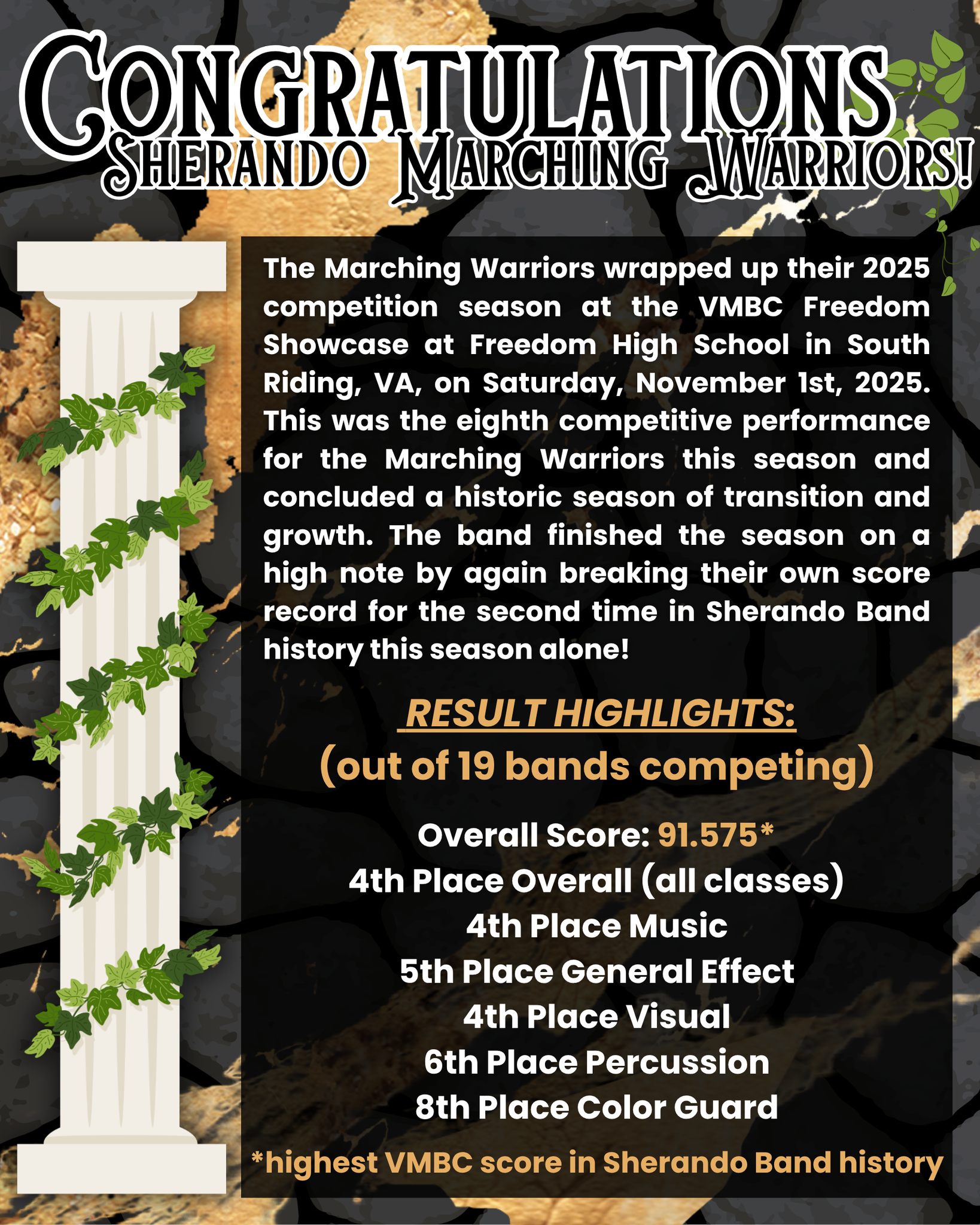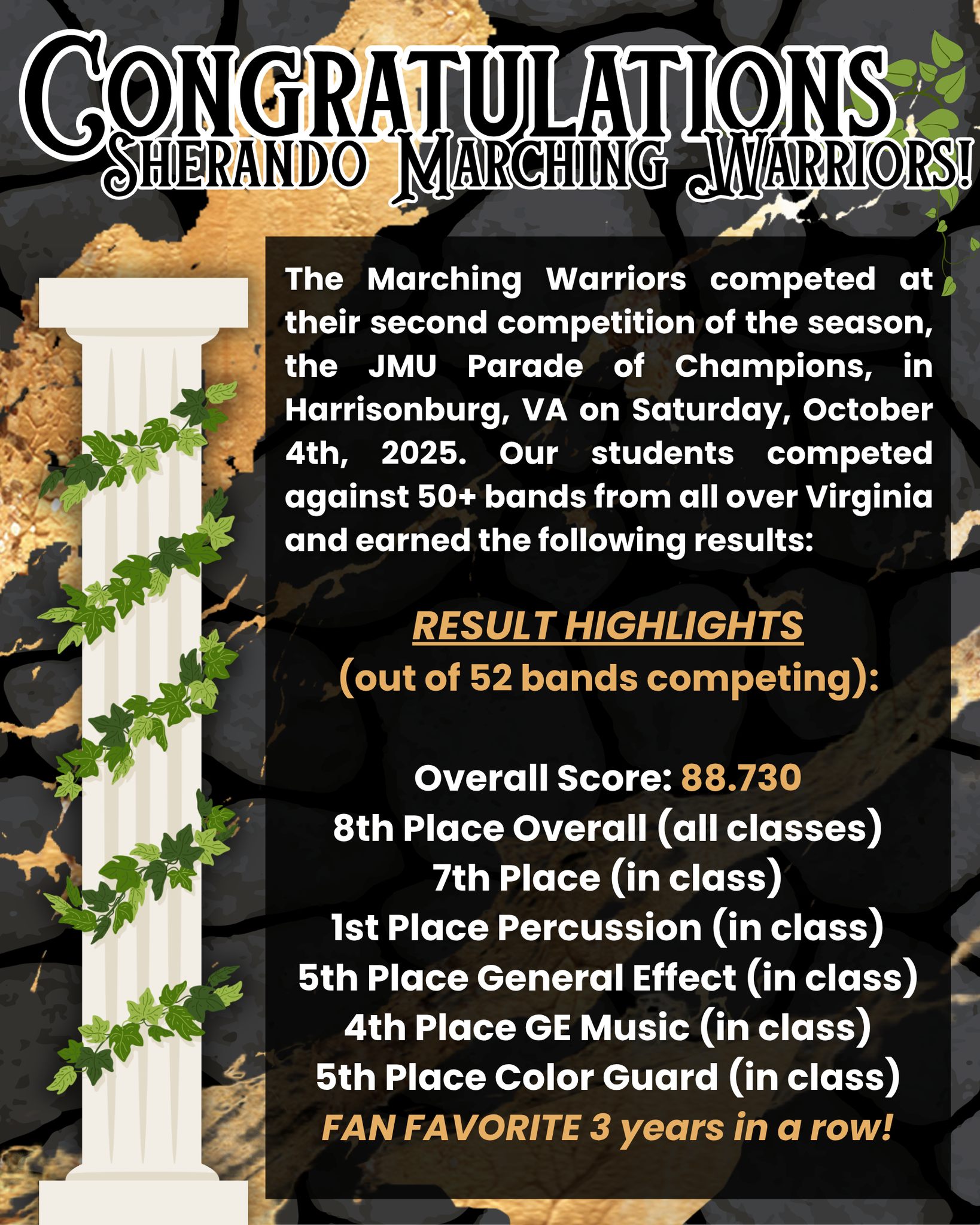 - 2nd Place Music & Visual, 3rd Place GE & Color Guard, 4th Place Percussion